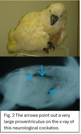 Diagnosis of PDD can be challenging and typically involves a combination of clinical signs, imaging, and laboratory testing. Radiographs or contrast studies may reveal an enlarged proventriculus (see Fig. 2). Polymerase chain reaction (PCR) testing can detect avian bornavirus in blood, cloacal, or choanal swabs, although intermittent shedding can lead to false negatives. Definitive diagnosis is often made through biopsy of affected tissues (such as the crop or proventriculus) demonstrating characteristic lymphoplasmacytic inflammation of the nerves. In some cases, diagnosis is confirmed post-mortem.