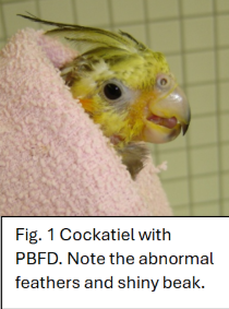 In species that produce heavy powder down, such as African grey parrots, cockatiels, and cockatoos, one of the earliest and most characteristic signs is the loss of the normal powdery coating, resulting in a noticeably glossy or shiny beak and feathers (see Fig.1). These species may also show subtle feather dystrophy before more obvious feather loss develops. African grey parrots are also more likely to show signs of generalized sickness and anemia (low red blood cell count) as the virus targets the bone barrow in this species causing a reduction in blood-forming cells.